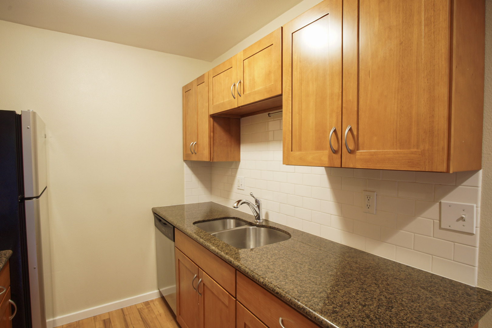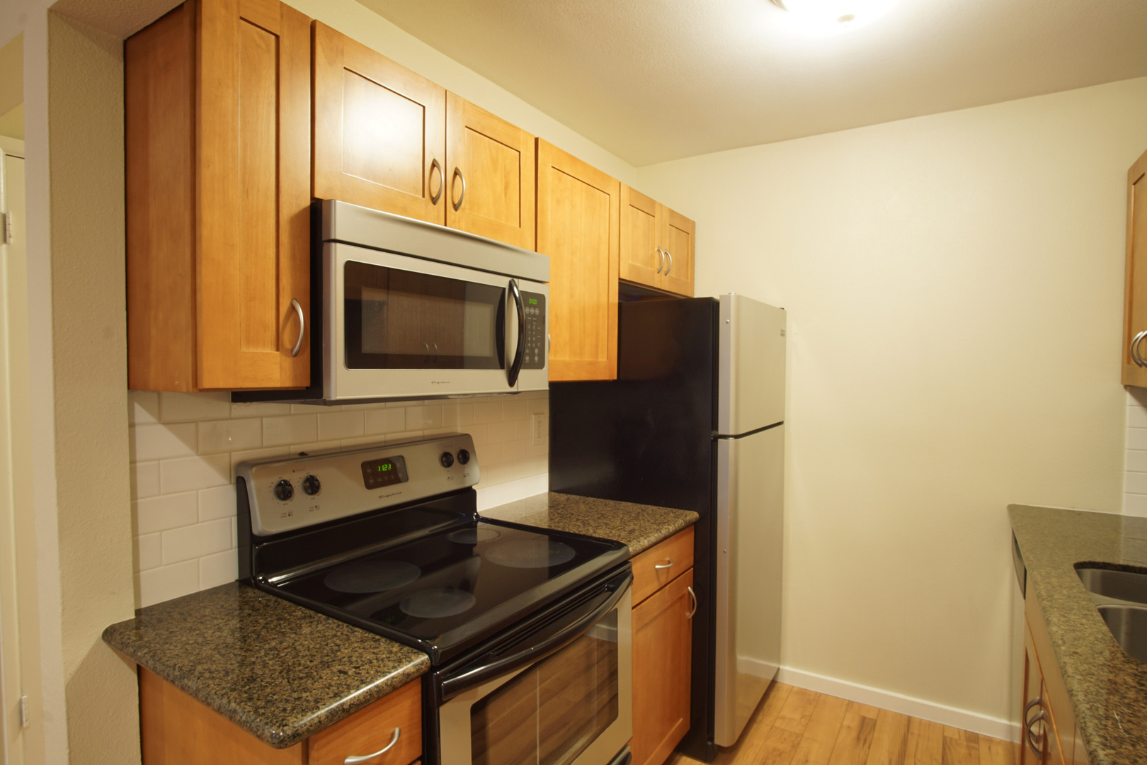- Kitchen has subway tile and granite countertops