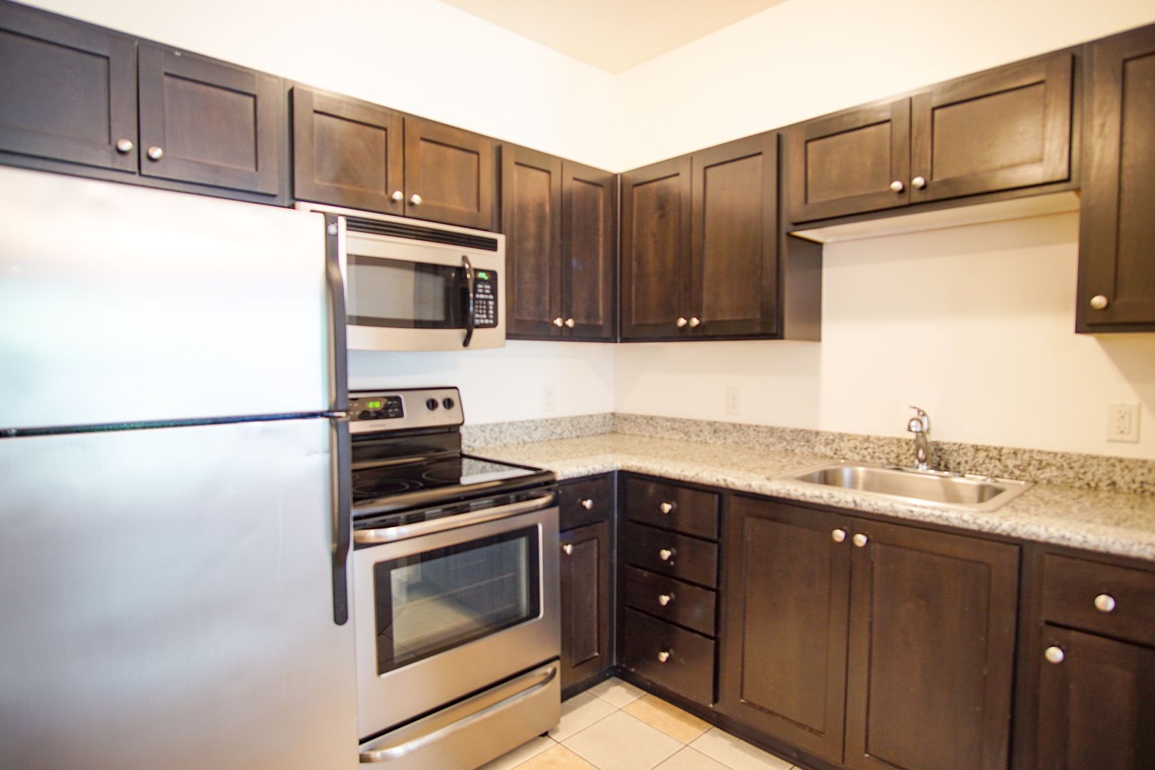 - Granite countertops and shaker cabinets