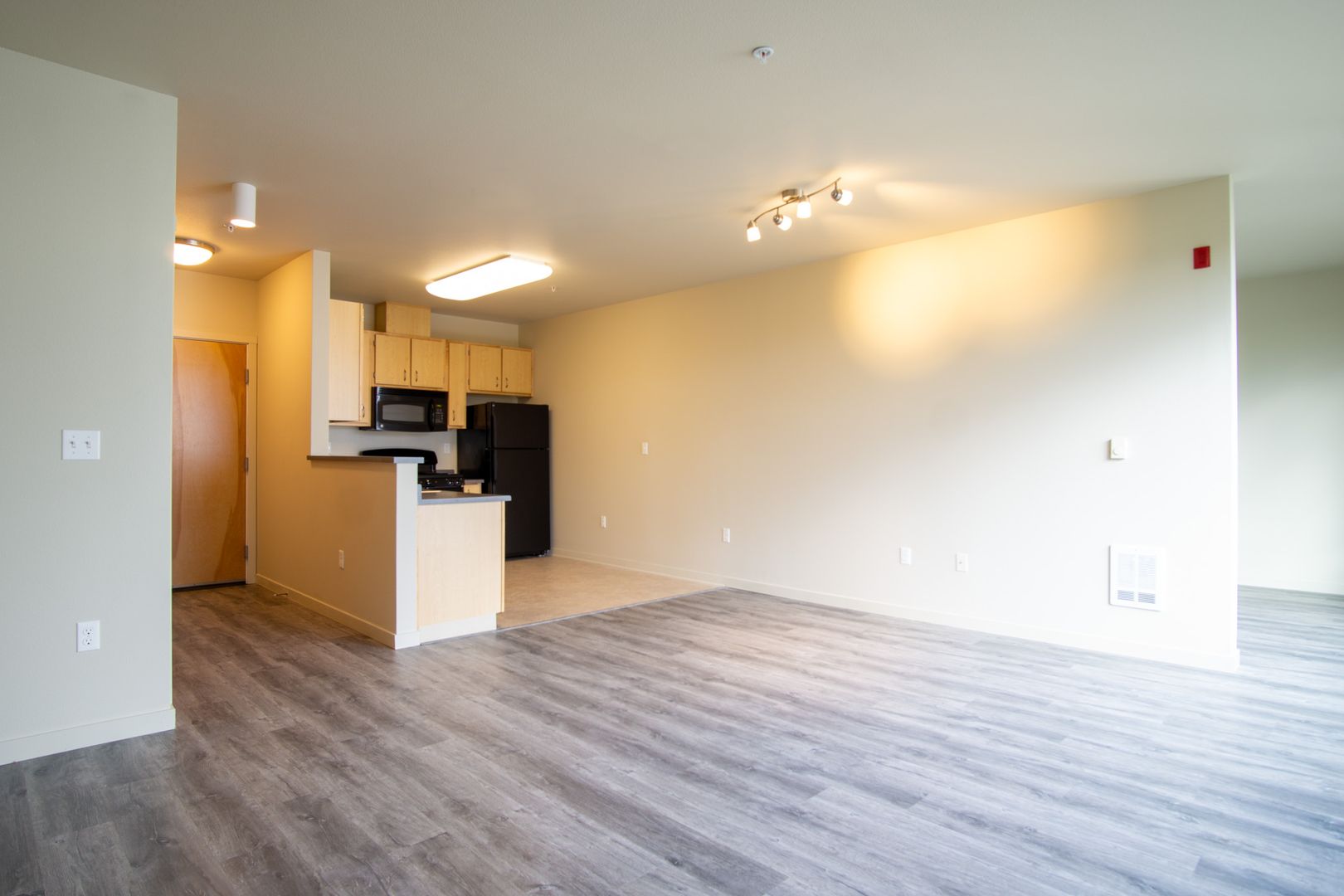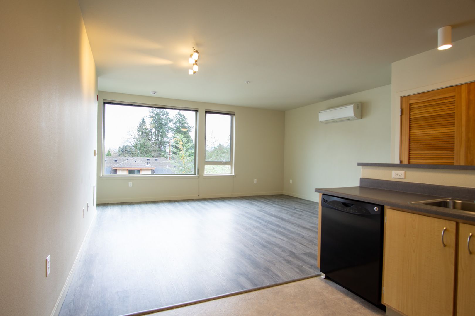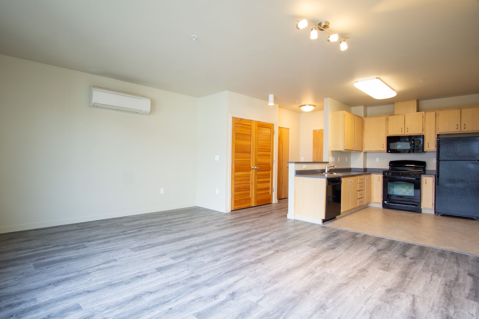 - Open floor plan accented with natural wood finishes
