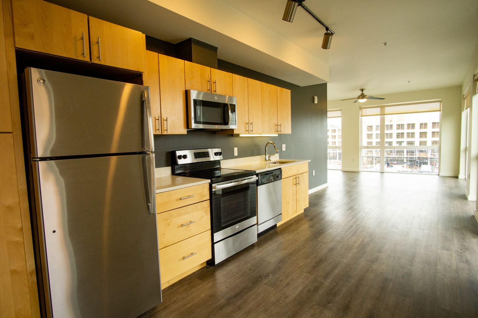 - Galley-style kitchen with modern appliances