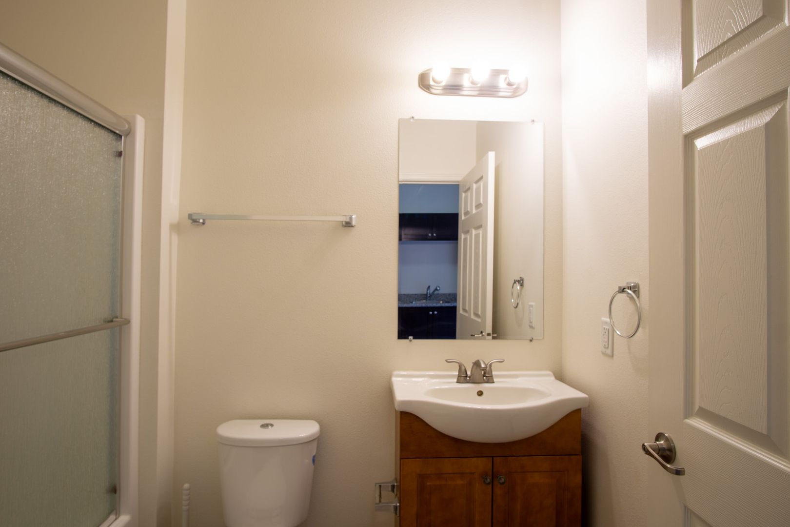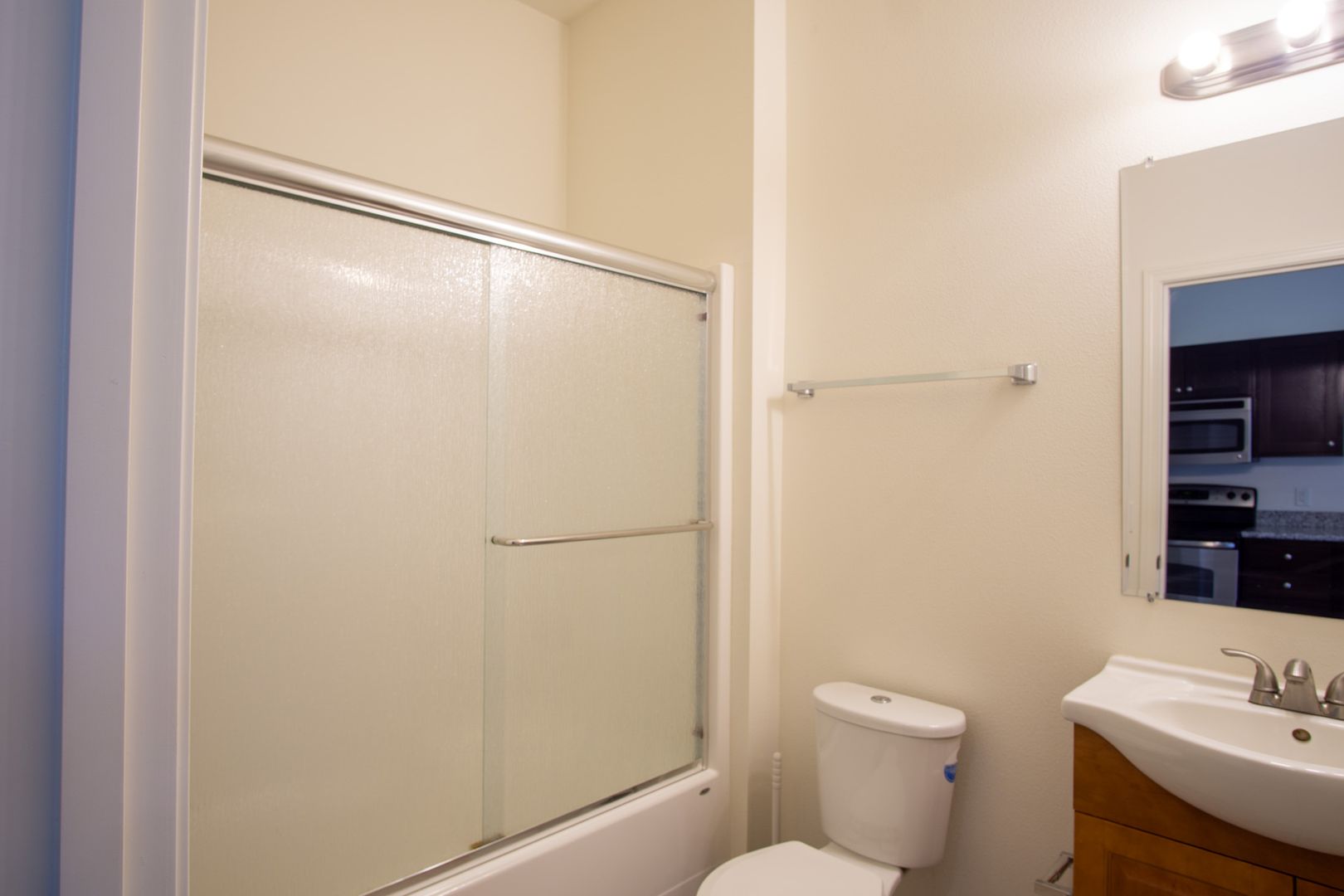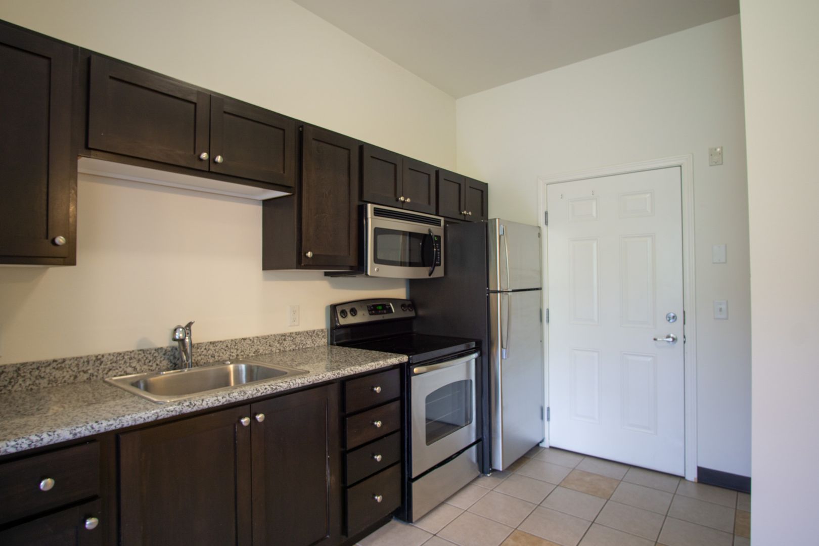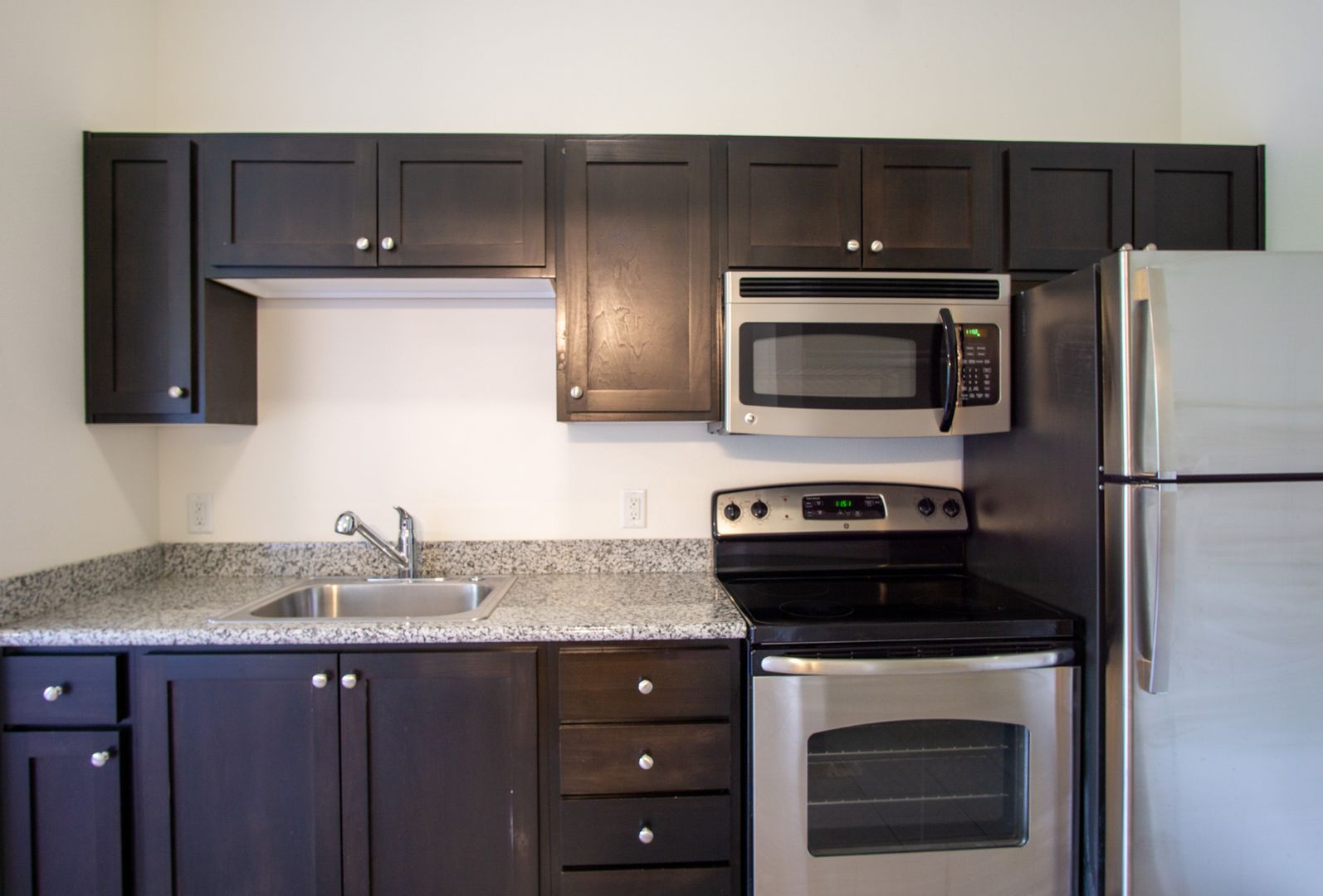 - Granite countertops + shaker cabinets