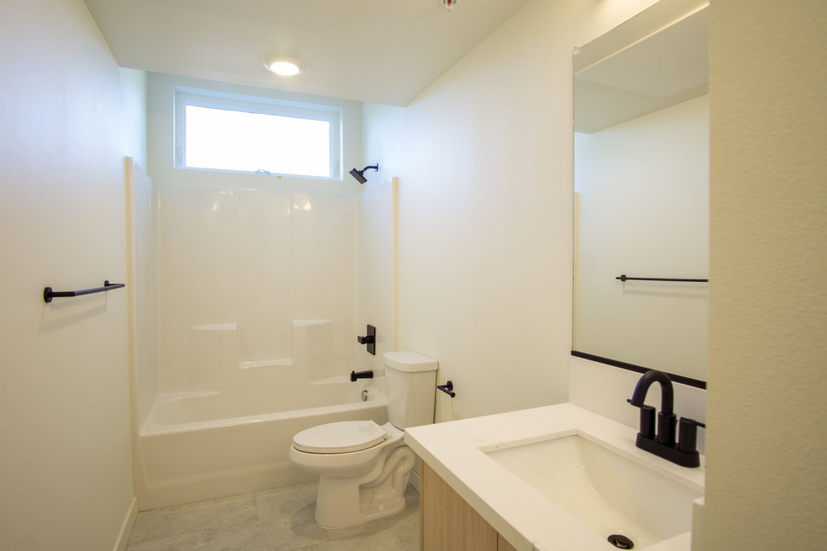 • Comfortable bathroom with custom tile, operable window, and modern LG Washtower washer and dryer