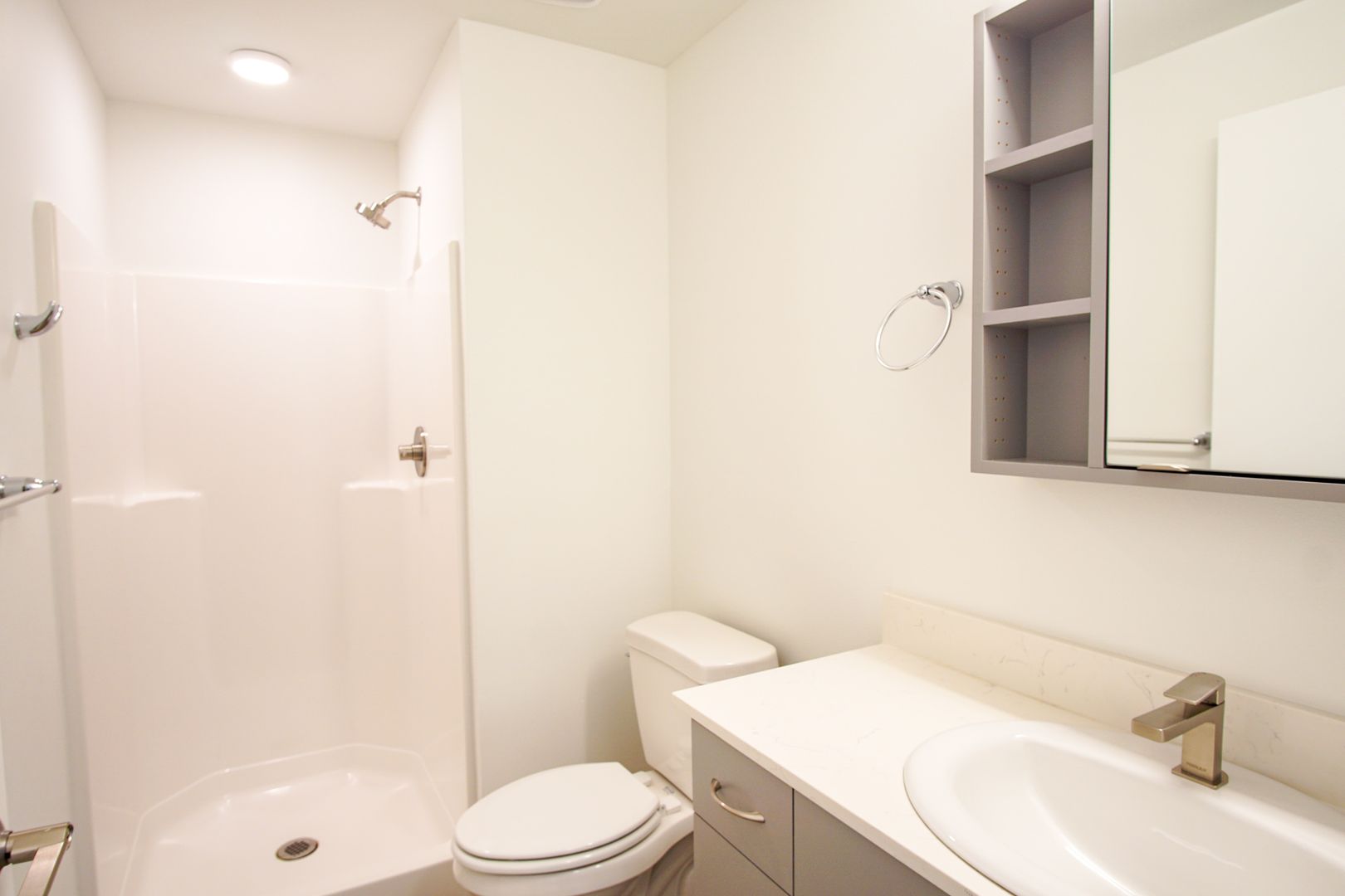 - Large walk-in stall shower