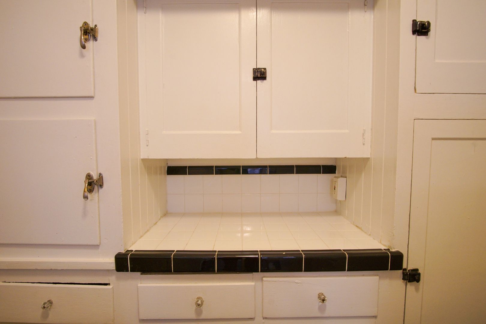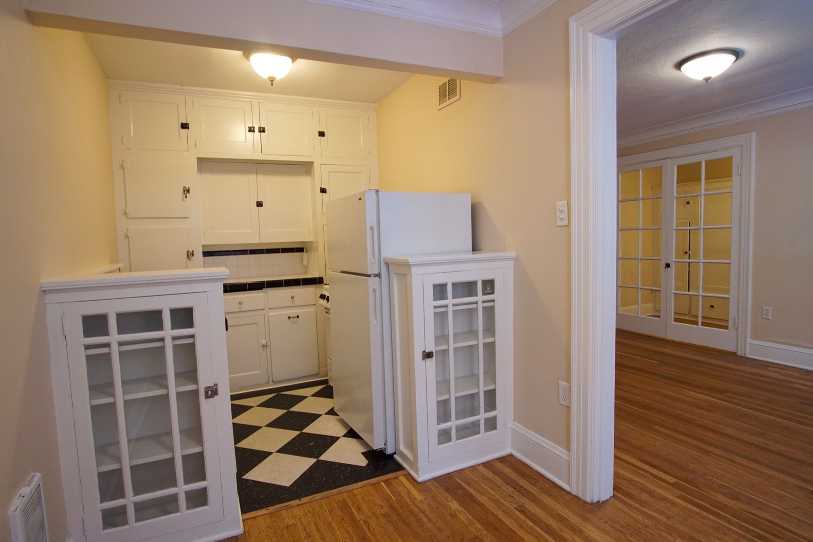 - Kitchen has classic checkered floors and lots of vintage cabinets